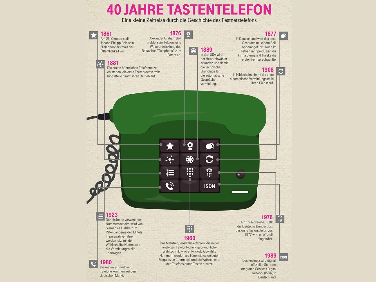 Noch heute ist der zwölfteilige Tastenblock Standard, doch spürbar komfortabler und ergonomischer: Zum Wählen wird auf nur noch leicht erhobene, wenig Widerstand leistende und oft beleuchtete Tasten getippt. Seit Ende der 1980er Jahre wird schnurlos im Festnetz telefoniert. Die Umstellung vom analogen auf das digitale Telefonnetz brachte schließlich mehrere Verbindungen über eine Leitung, eine schnellere Datenrate und sehr viel mehr Komfort: Anrufbeantworter, Rufnummernspeicher, Wahlwiederholung und Freisprecheinrichtungen, Babyphone, Wecker, Telefonbuch, Geburtstagsanzeige und eine Tonqualität in HD kommen als Komfort-Features dazu. Und doch: Die alte Wählscheibe ist noch nicht ganz tot. Per App kommt sie auf den Smartphone-Touchscreen und lässt Nostalgiker im alten Wählscheibenoutfit telefonieren.