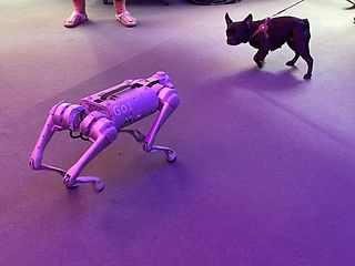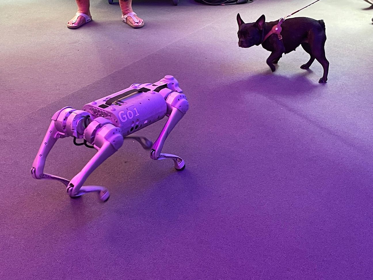 Interesse auch für Roboter: Sie halten Einzug in unser Leben, etwa als Servierer in der Gastronomie. Auf der Digital X zieht mich lautes Getrampel in einem Zelt an. Neugierige stehen am Eingang, aber nicht alle treten ein. Drinnen laufen zwei Roboterhunde wie wild herum.