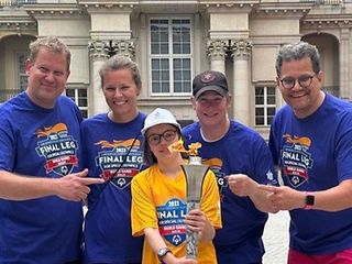 Auf dem Bild sind Helfer zu sehen: Markus Hylinski, Vera Niedergesäß, Stuart Cunningham, Pawel Dillinger (von links) mit Athletin in der Mitte. © Deutsche Telekom