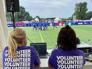 Tolle Momente erleben auch die Volunteers beim olympischen Fußballturnier. Eben noch ihre Vorbereitungen in der eigens für die Special Olympics produzierten MagentaTV Dokumentation "JETZT! WIR! Special Olympics in Berlin" im Fernsehen bestaunt, jetzt live auf dem Spielfeld erlebt: Unsere Fußballfrauen geben alles! Sie als Volunteer nach der Akkreditierung zum Spielfeld begleiten zu dürfen, ist immer eine besondere Ehre. Auch wenn man mit ihrer Torfrau Natascha Wermelskirchen dabei kaum Schritt halten kann, so zielstrebig eilt sie Richtung Aufwärmfeld.