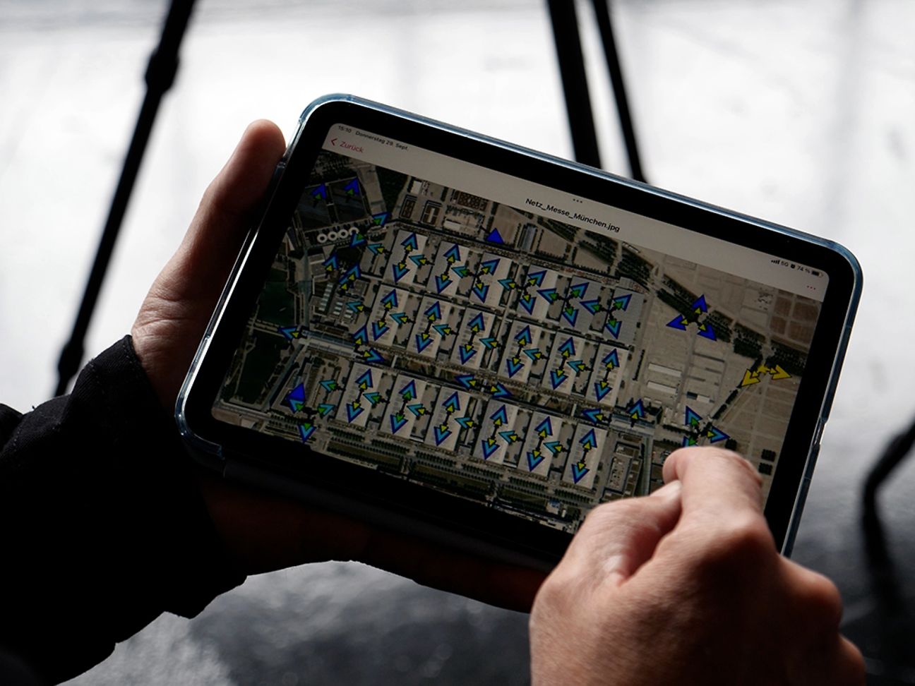 Um die vier temporären Standorte auf dem bauma-Außengelände hat sich Tobias Gruschka mit seinem Team gekümmert. Er ist bei der Telekom Spezialist bei der Squad „Temporäre Mobilfunkversorgung“ – also für Projekte, bei denen ein Handynetz nicht dauerhaft aufgebaut wird, sondern ganz flexibel für bestimmte Events oder Einsätze. Er kann den Mobilfunk auf der bauma deshalb bestens vergleichen, zum Beispiel mit einem großen Popkonzert: „Auf einem Konzert hast du viele Menschen in einer recht kurzen Zeit auf einer kleinen Fläche. Hier auf der bauma haben wir natürlich auch viele Menschen – aber auf einer sehr großen Fläche und über eine sehr lange Zeit. Da verteilen sich die Leute dann gleichmäßig.“