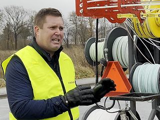Und wie schnell läuft jetzt das Verlegen in der Praxis, im Sturm und Regen von Lübbecke? Experte Anders Mikkola hat beeindruckende Zahlen parat: „Gestern am ersten Tag haben wir 320 Meter geschafft. Und heute bis elf Uhr vormittags waren es schon wieder mehr als 200 Meter. Das läuft sehr gut.“ Im Vergleich zum üblichen Tiefbau, der täglich gute 50 Meter vorankommt, ist das ein Quantensprung beim Glasfaserausbau. Mikkola verrät, dass es in Schweden zunächst Vorbehalte gegen diese Ausbauvariante gab – die dann aber durch praktische Erfolge schnell ausgeräumt waren. Heute zählt das Diamant-Mikrotrenching in Skandinavien längst zu den Standard-Methoden beim Verlegen von Glasfaser. In Deutschland sträuben sich Kommunen und Behörden häufig noch gegen das Trenchen – weil sie seit Jahren und Jahrzehnten an den Tiefbau mit seinen Baugruben gewöhnt sind. Ohne diese Skepsis, die sachlich nicht mehr gerechtfertigt ist, könnte der Glasfaserausbau in Deutschland noch wesentlich schneller vorankommen.