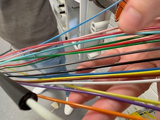 Die 16 Bündeladern, in denen die Glasfaser liegt, sind die reinste Villa Kunterbunt in 12 verschiedenen Farben. Trainer Streich erklärt die Aufgabe der Farben: „Sie spielen bei uns im Netz eine ganz wichtige Rolle. Damit der Monteur draußen die Vielzahl an Fasern auseinanderhalten kann, brauchen wir einen Farbcode.“