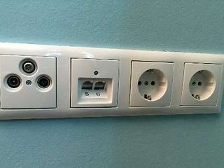 In jedem Raum sollte mindestens eine Netzwerk-Doppeldose (2xRJ45), bei größeren Räumen sollten zwei Doppeldosen an gegenüberliegenden Wänden installiert werden. Die Nutzung der Räume bestimmt die Anzahl der Anschlüsse. Als Richtwert hat sich ein Anschluss pro 3,75 m Raumumfang bewährt. Geeignete RJ45-Netzwerkdosen sind in den handelsüblichen Schalterprogrammen verfügbar. Es wird empfohlen, zu jeder Netzwerkdose eine Steckdose (230V) für die Stromversorgung der Endgeräte einzuplanen (s. Bild).
