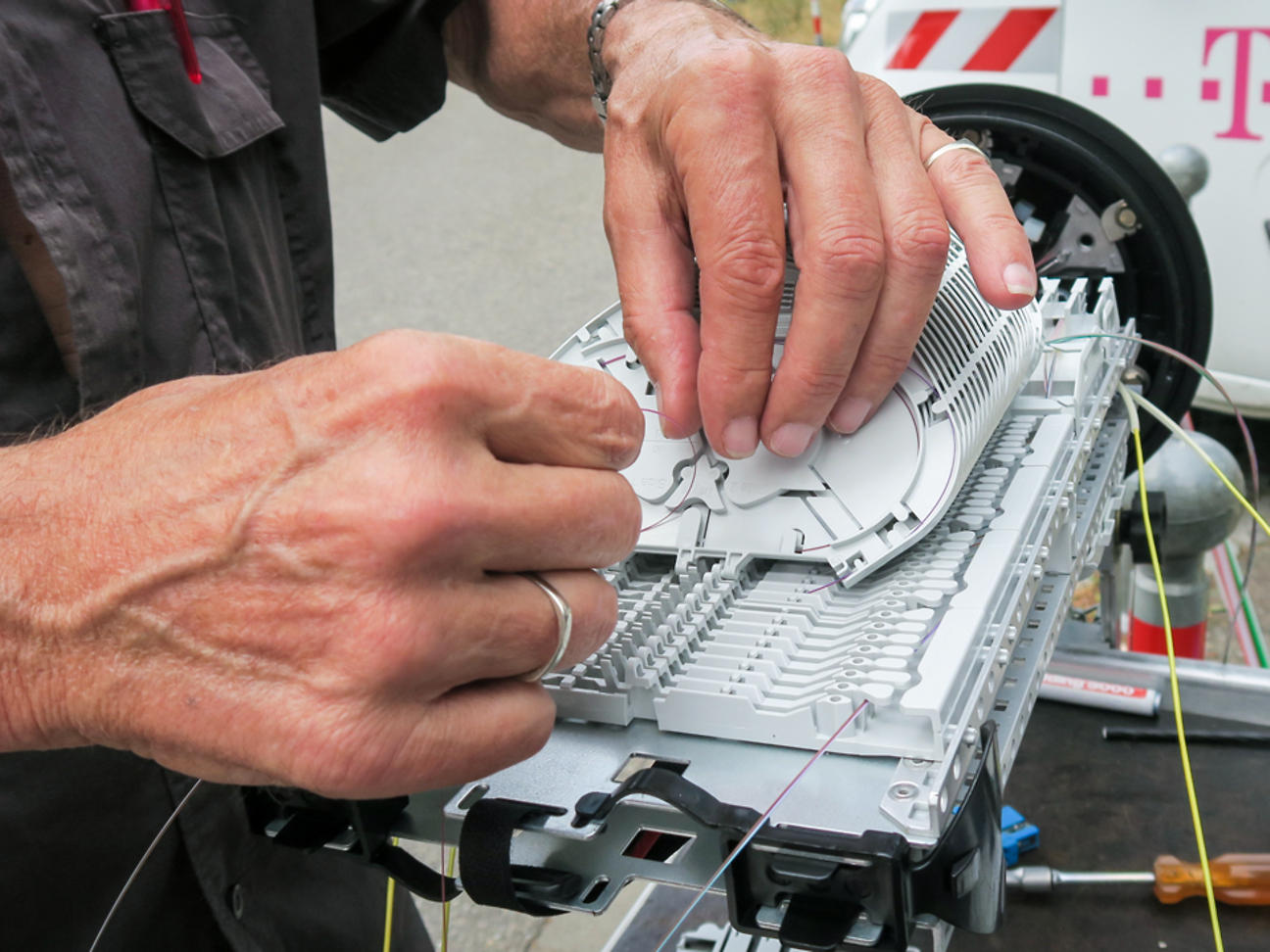 Doch erst das anschließende Verbinden der hauchfeinen Einzelfasern koppelt die Haushalte und Unternehmen an die Highspeed-Technik in den Betriebsstellen der Telekom.