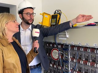 Michael Nagel (r.) von der Hochschule Mittweida unterstützt das 5G-Projekt in Jena. Hier erklärt er unserer Reporterin, Sandra Rohrbach, wie 5G hilft, den Bus effizient zu laden.