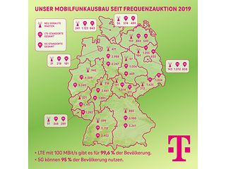 Trotz aller Widrigkeiten ist der Mobilfunkausbau mit großem Tempo in den letzten Jahren zügig vorangekommen. Die Telekom hat seit der Frequenzauktion 2019 deutschlandweit bis Jahresende 2022 insgesamt 4.800 neue Masten gebaut. Außerdem wurde ein Großteil der bestehenden 34.000 Standorte modernisiert. Die Unterstützung von Behörden, Kommunen und den Menschen vor Ort hat dazu beigetragen, dass die neue Mobilfunkgeneration 5G bereits heute 95 Prozent der Bevölkerung zur Verfügung steht.  Mit ihrem Ausbau hat die Telekom auch die Vorgaben der Bundesnetzagentur erfüllt: 99,6 Prozent der Bevölkerung bundesweit steht LTE mit mindestens 100 Mbit/s zur Verfügung. Auch in den einzelnen Bundesländern übertrifft die Telekom deutlich die LTE-Ausbauvorgaben von 98 Prozent der Bevölkerung.