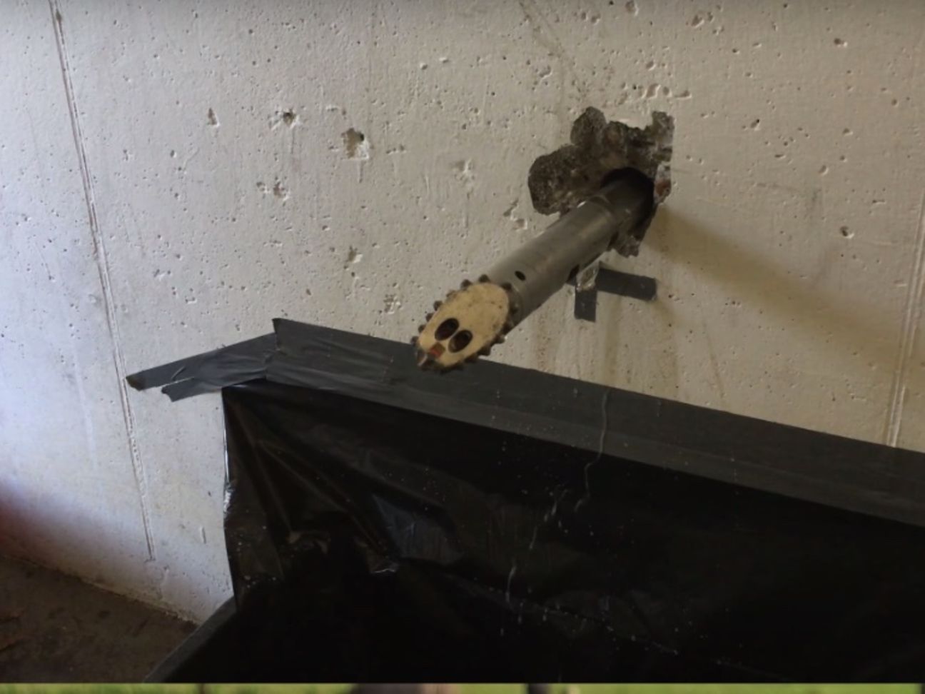 Fast auf den Zentimeter genau durchstößt der Bohrkopf die vorgesehene Stelle in der Garagenwand.