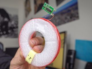 Im Wasserbad schwimmt die eigentliche Technik des Kugelmarkers - die durch das Wasser immer horizontal ausgerichtet ist, egal, wie der Ball im Erdreich liegt. Wer den nützlichen Ball komplett öffnet, findet darin, gut geschützt vor der Flüssigkeit, eine Art Puck mit einer Spule und einem Kondensator, die elektrische Schwingungen ausführen können.