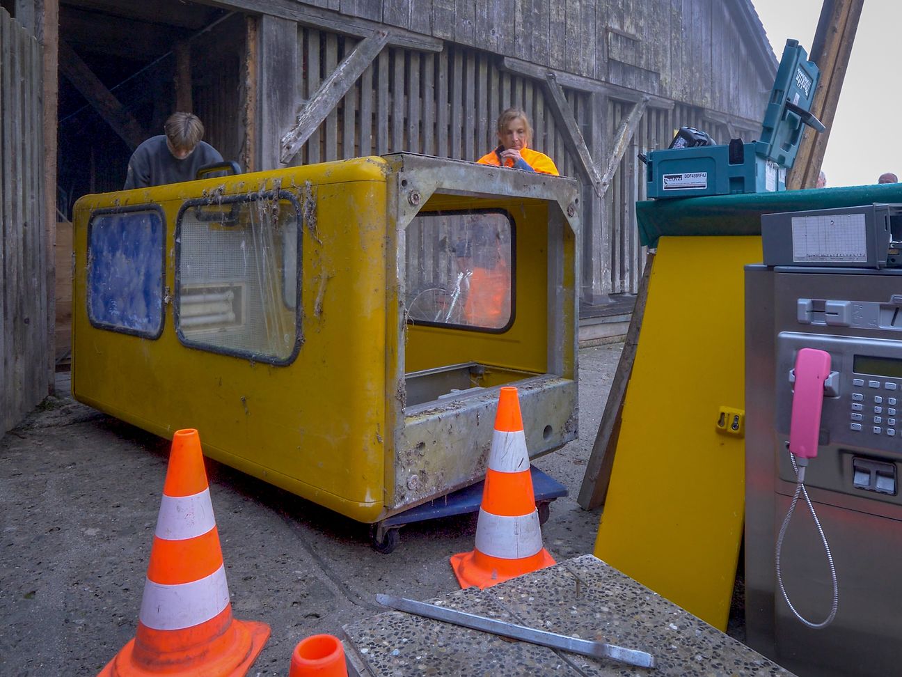 Das gelbe Telefonhäuschen wird ausgebaut und abtransportiert