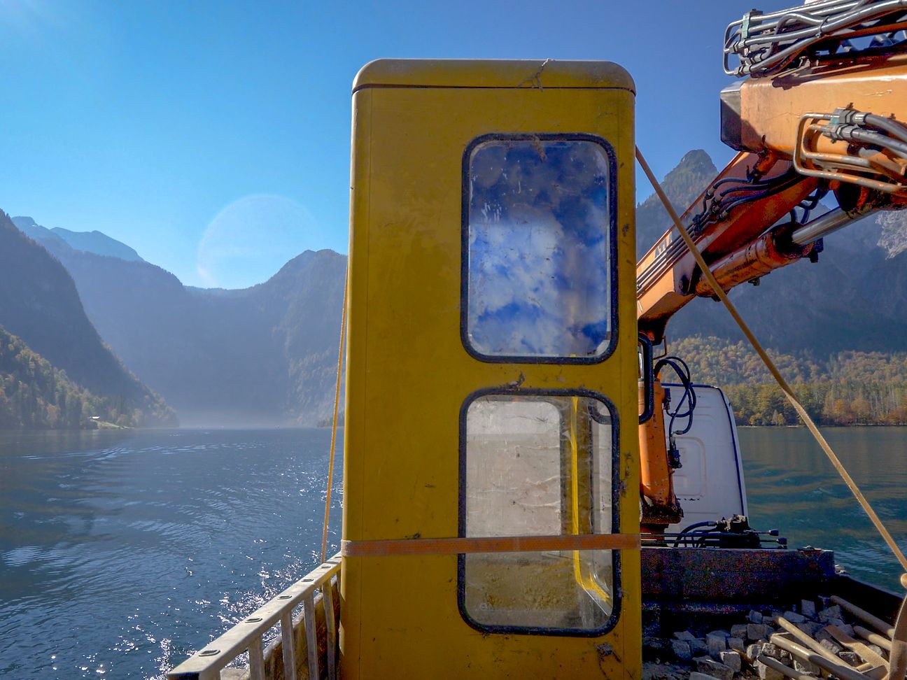 Das Besondere an dieser Demontage: Die grandiose Bergkulisse, die aber auch mit Tücken daherkommt. Zwar wurde die Telefonzelle wie üblich nach der Demontage auf die Ladefläche eines LKWs gehoben, doch für den ging es samt Fracht zunächst auf eine Fähre. Denn St. Bartholomä ist ausschließlich auf dem Wasserweg zu erreichen. So bekam die gelbe Telefonzelle zum Abschied also eine sonnige Fahrt über den klaren Königssee nach Schönau spendiert.