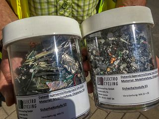 "Die Software wird auf Werkseinstellung zurückgesetzt, und alle Daten werden gelöscht", erklärt Recycling-Experte Fröhlich für die Geräte, die weiter benutzt werden. SIM-Karten und SD-Karten werden entnommen und geschreddert. Der „Datenstaub“, der dann übrigbleibt, ist rund drei Millimeter groß, Experten sprechen von der Sicherheitsstufe 5 – damit sind die Datenträger komplett zerstört. Bei den Geräten, die weitergenutzt werden können, werden die Daten durch einen DEKRA zertifizierten Prozess nach dem Stand der Technik gelöscht.