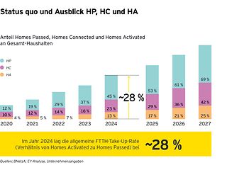 Die Studie hebt weiter hervor, dass aufgrund der hohen Kosten für ausbauende Unternehmen ein großer Anreiz besteht, möglichst viele neue Kunden für ihr Glasfaserangebot zu gewinnen. Denn erst die Buchungen von Glasfaserprodukten generieren Erlöse und refinanzieren die Investitionen in die neue Infrastruktur. Der Gebäudeanschluss wird damit zur zentralen Voraussetzung auf der Erlös-Seite. Der Übergang von versorgtem Haushalt (Homes Passed) zu angeschlossenem Haushalt (Homes Connected) und Haushalt mit aktivem Anschluss (Homes Activated) ist daher von hoher Relevanz. Die EY-Autoren gehen davon aus, dass sich das Verhältnis von Homes Passed zu Homes Connected von heute rund 28 Prozent auf 36 Prozent im Jahr 2027 steigern wird.