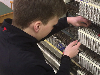 Dieser Aufbau sieht so aus: Im Keller des Gebäudes befindet sich der Kabelaufteilungsraum. Hier kommen die aus den Außenbereichen zugeführten Kabel an – zum Beispiel von Multifunktionsgehäusen in den Stadtvierteln. Diese Leitungen stoßen als dicke Erdkabel durch die Wand. Sie enthalten jeweils Hunderte dünne, verdrillte Telefonkabelpaare aus Kupfer oder dicke Bündel von Lichtwellenleitern (LWL). Im Innenbereich ist die Schutzhülle der Erdkabel überflüssig und wird entfernt. Die einzelnen Kupferkabel und Lichtleiter laufen über Führungen ins Erdgeschoss.Hier steht der raumfüllende Kupferhauptverteiler, kurz HVT. Auf der einen Seite hat das Team um Michael Bohlender die bis zu 2.000 Kupferdoppeladern pro Kabel auf Terminals geklemmt.