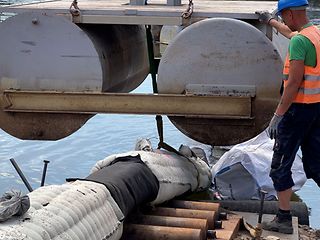 Am D-Day, also quasi am „Düker-Tag“, zieht zunächst ein kleines Arbeitsboot den mehr als 200 Meter langen Rohrverband quer über den Fluss zum gegenüberliegenden Ufer. Dort nimmt ein Kran die Konstruktion an den Haken und zieht sie an Land. Der Weg über die Mosel ist damit geschafft – und die schwimmende Leitung sieht beinahe aus wie ein neues Werk des 2020 verstorbenen Verpackungskünstlers Christo. Aber im Flussbett liegt das Rohr noch längst nicht. Dann kommen die Taucher ins Spiel. Sie lösen nach und nach die Auftriebskörper und lassen den Rohrverband von schwimmenden Arbeitsplattformen aus langsam ins Wasser. Für die Taucher, die die Rohre von ihren Befestigungen lösen müssen, ist das kein einfacher Job. Sie müssen sich im trüben Moselwasser orientieren, in dem die Sicht kaum einen Meter weit reicht. Und wenn der Rohrverband nicht direkt über der vorgesehenen Rinne liegt, in der er schlussendlich landen soll, müssen das große Transportschiff und ein Bagger die Richtung korrigieren. So feinfühlig und zentimetergenau agieren die großen Gerätschaften sonst nur in den Baggerwetten von „Wetten, dass..?“