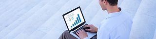 Man with a laptop sitting on stairs.