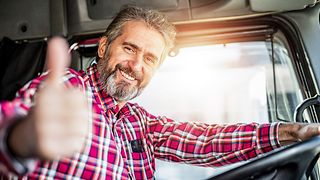 LKW-Fahrer schaut auf Lieferdokument und Handy.