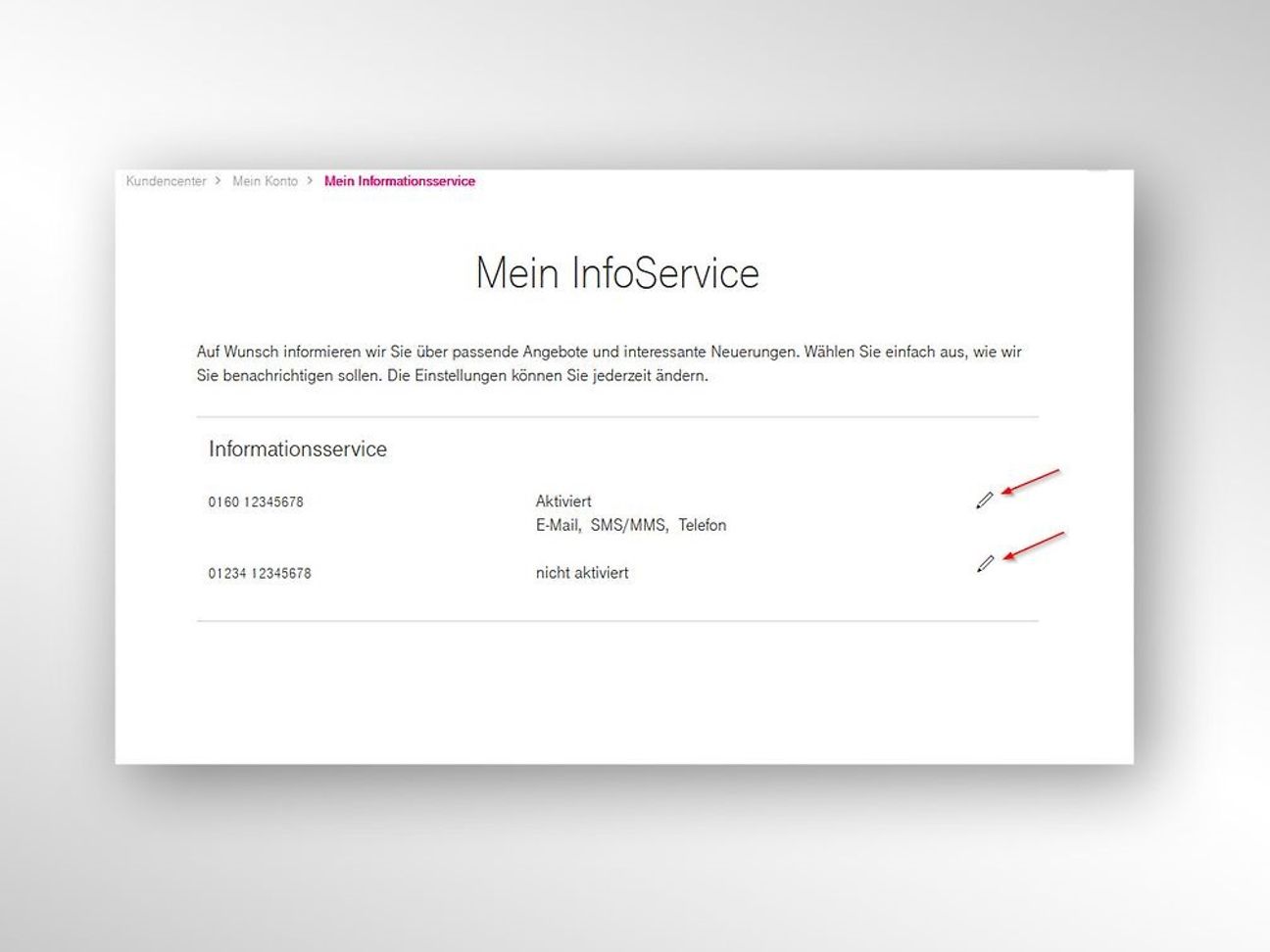 Unter dem Punkt InfoService entscheiden Sie, ob Sie von der Telekom Neuigkeiten erhalten möchten. Wir informieren regelmäßig zu Produkten, Angeboten und Servicedienstleistungen, zum Beispiel zum Thema Netzausbau. Sie wählen aus, wie Sie benachrichtigt werden und können dies jederzeit ändern. Mehr Informationen zum InfoService gibt es hier.
