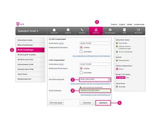 Einloggen > (1) Netzwerk > (2) WLAN-Einstellungen > Name und Verschlüsselung > Verschlüsselungsart > (3) WPA2 oder, wenn möglich, WPA2/WPA3 auswählen > [Optional] (4) WLAN-Schlüssel ändern > (5) Speichern