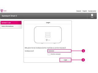 Geben Sie http://speedport.ip in die Adresszeile Ihres Browsers ein. Schließen Sie dabei immer alle weiteren Internetseiten, die auf Ihrem Computer geöffnet sind (1). > Geben Sie das Passwort des Routers ein. Sie finden es auf der Rück- oder Unterseite Ihres Gerätes (2). > Klicken Sie auf Login.