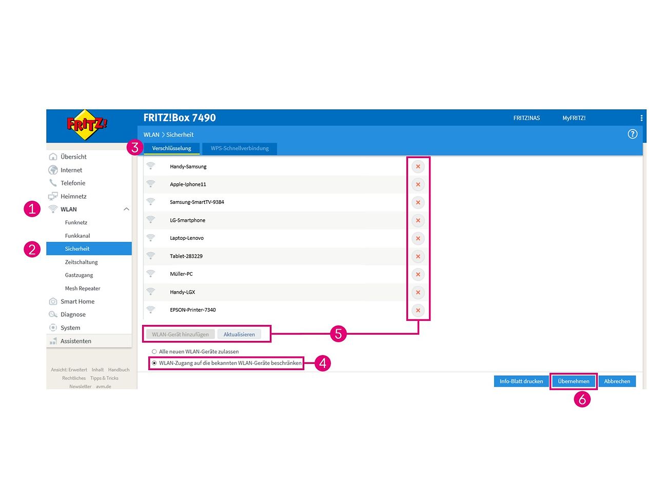 Einloggen > (1) WLAN > (2) Sicherheit > (3) Verschlüsselung > (4) WLAN-Zugang beschränken > (5) WLAN-Gerät hinzufügen oder über die Kreuze entfernen > (6) Übernehmen