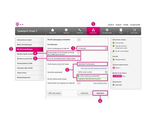 Einloggen > (1) WLAN > (2) Gastzugang > (3) Gastzugang aktvieren > (4) Namen des Gastzugangs festlegen > WPA2 + WPA3 als Verschlüsselung wählen > WLAN-Netzwerkschlüssel vergeben > (5) Übernehmen