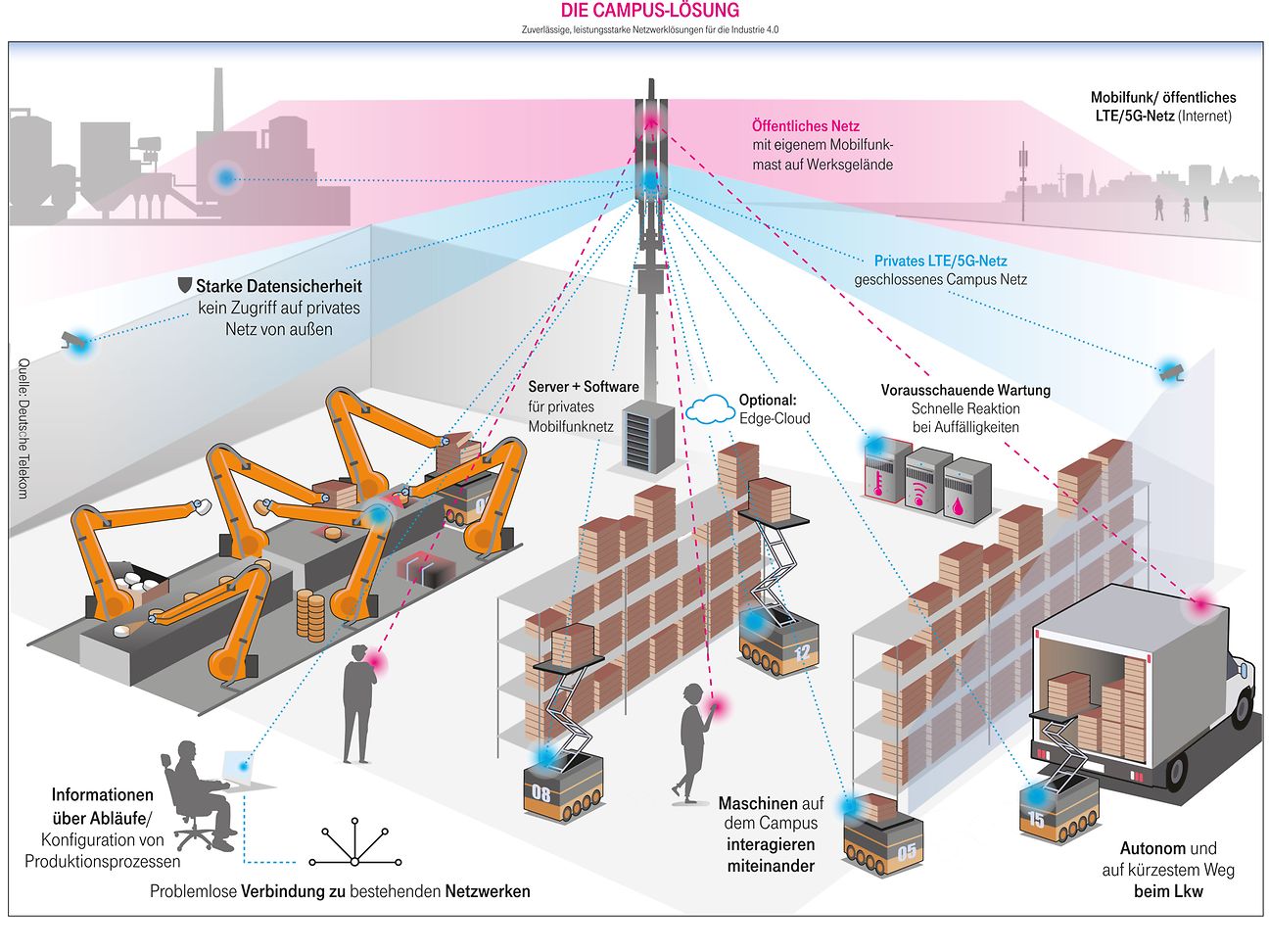 Die Telekom testet zusammen mit dem Unternehmen OSRAM zum ersten Mal ein Campus-Netz, um Maschinen in einem realen Produktionsumfeld drahtlos zu vernetzen. Um die hochentwickelten und automatisierten Produktions- und Logistikverfahren zu beschleunigen, ist zusätzlich zum öffentlich verfügbaren LTE-Funknetz auf dem Werksgelände ein separates privates LTE-Netz entstanden.