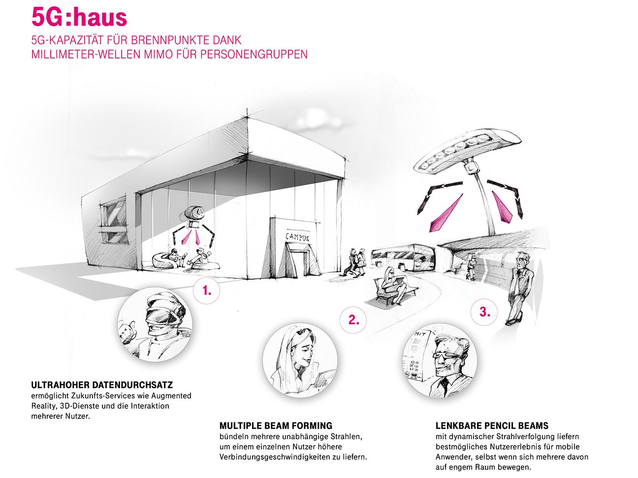Die Telekom hat das Potenzial von Millimeter-Wellen-Multi-User MIMO als 5G-Innovation für besonders anspruchsvolle Szenarios unter Beweis gestellt. In diesen müssen Netzbetreiber ultrahohe Datenraten bieten, um den Anforderungen in belebter Umgebung gerecht zu werden. Mit dem 5G:haus hat die Telekom die besten Voraussetzungen, um gemeinsam mit den führenden Partnern die neuesten Technologien zu evaluieren und 5G Realität werden zu lassen.