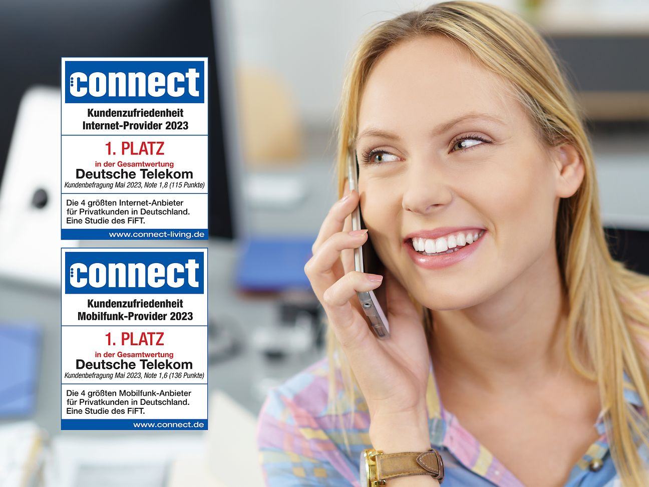 Zu sehen sind eine zufriedene Telekom Kundin und die beiden Siegel von connect