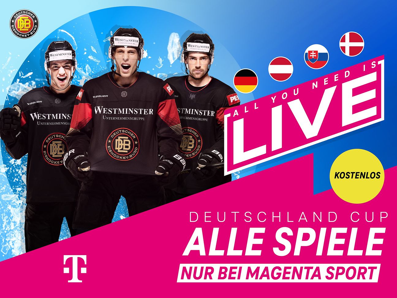 MagentaSport zeigt alle Spiele des Deutschland Cups mit vier Top-Eishockey-National-Teams, darunter Gastgeber Deutschland sowie die beiden WM-Qualifikationsspiele der deutschen Basketball-Nationalmannschaft live.