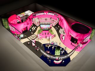 Rund 1.000 Quadratmeter Fläche, viele KI-basierte Innovationen und ein imposantes 3D-Logo: Der Stand der Telekom beim MWC.