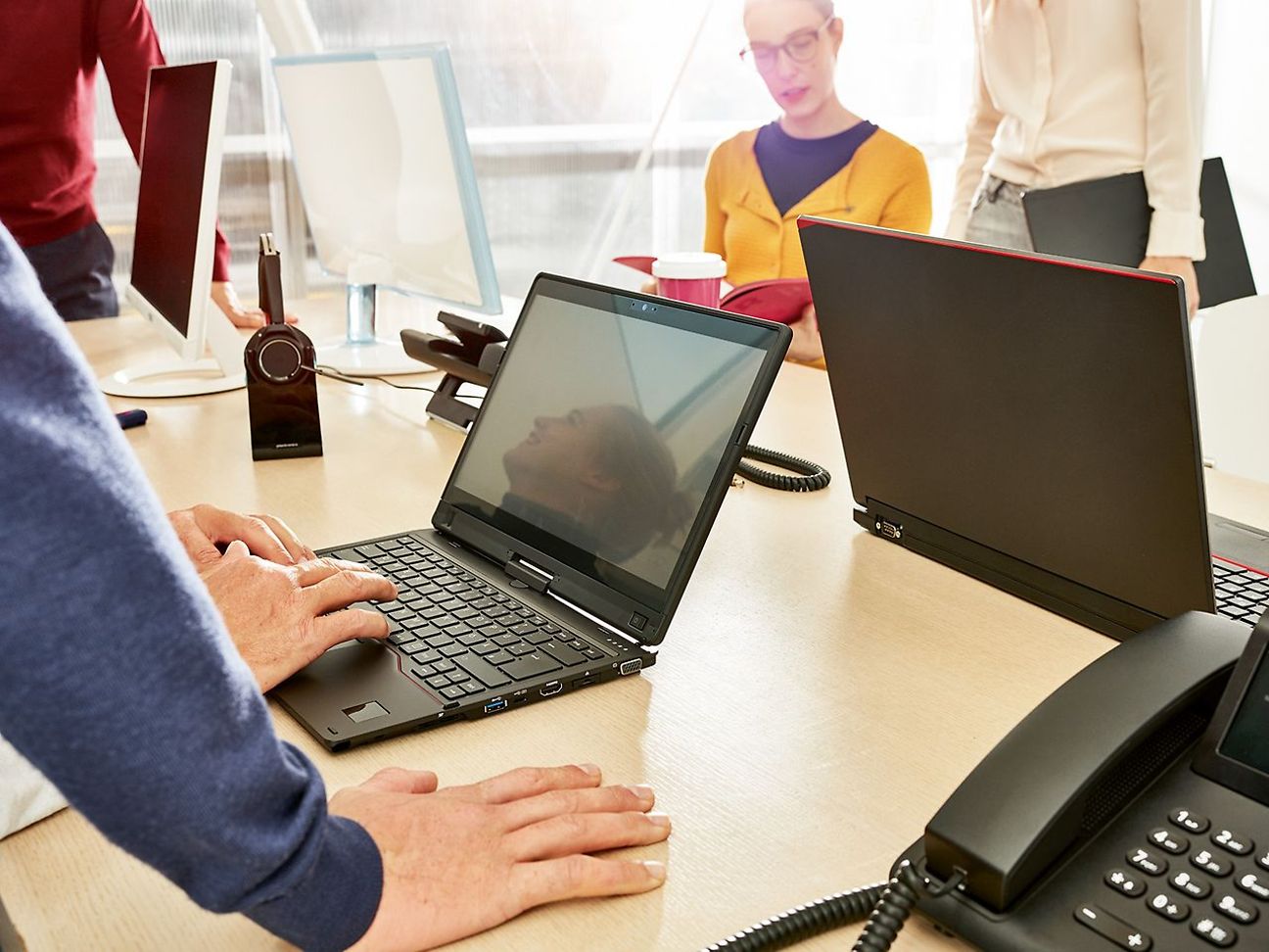 Schreibtisch mit verschiedenen Computern und Menschen, die diese bedienen und sich dabei austauschen.