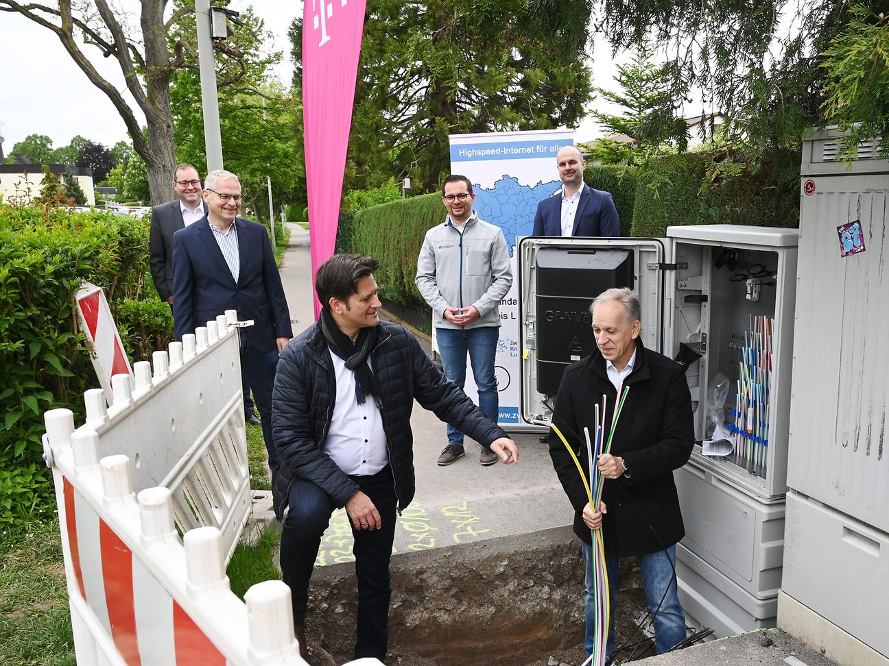 Volker Ackermann und Dirk Schaible stehen in der Baugrube vor einem Verteilerkasten, drum herum weiteren Personen.