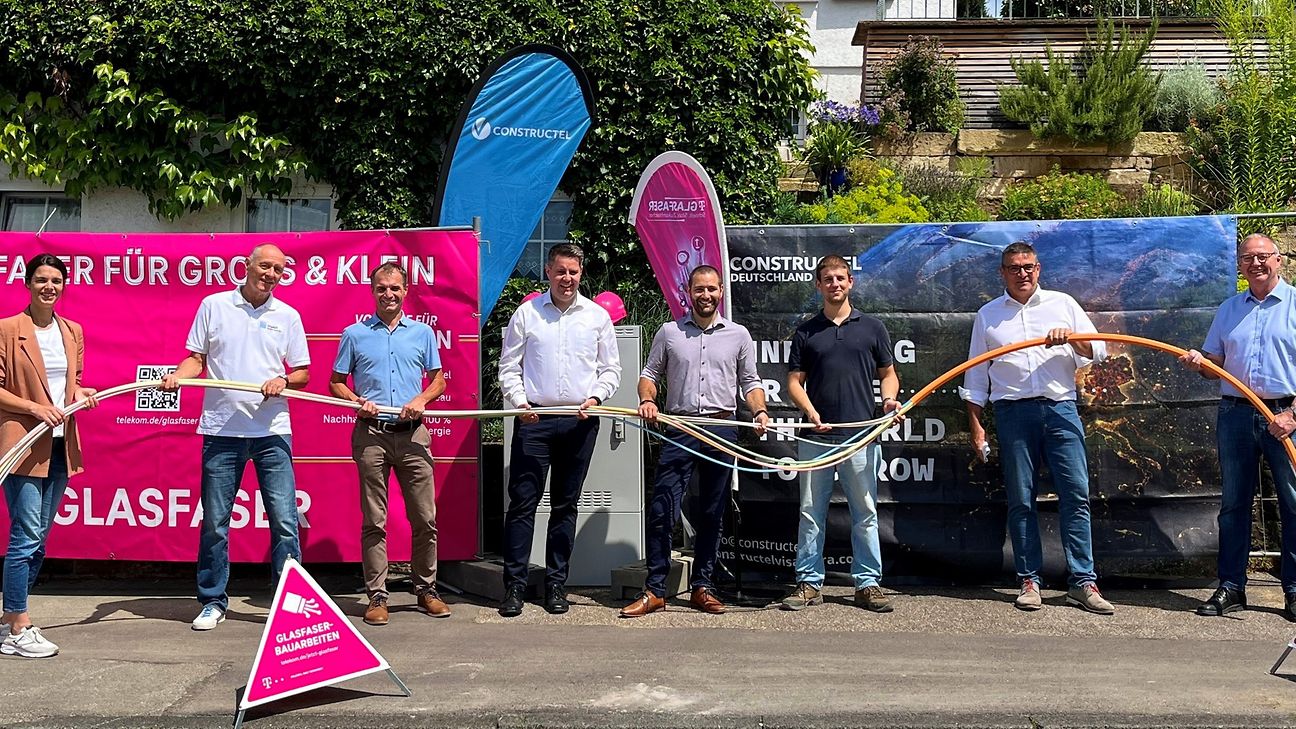Die Beteiligten stehen vor einem Verteilerkasten und Bauplakaten und halten gemeinsam eine Speedpipe in Händen.