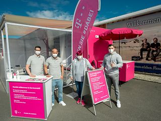 Kühl ist es, aber der Himmel lässt Blau durchschimmern. Die Tour des Servicemobils in Sankt Peter-Ording ist gut angelaufen. Frisch getestet und geschützt durch ein umfassendes Hygienekonzept lösen vier Service-Kolleg*innen im Wechsel verschiedene Kundenanliegen, von Rechnungs- und Tariffragen bis hin zu technischen Störungen am Anschluss oder im Heimnetzwerk. Das rollende Servicecenter steht auf dem Parkplatz eines Getränkemarkts - zentral gelegen und gut erreichbar.