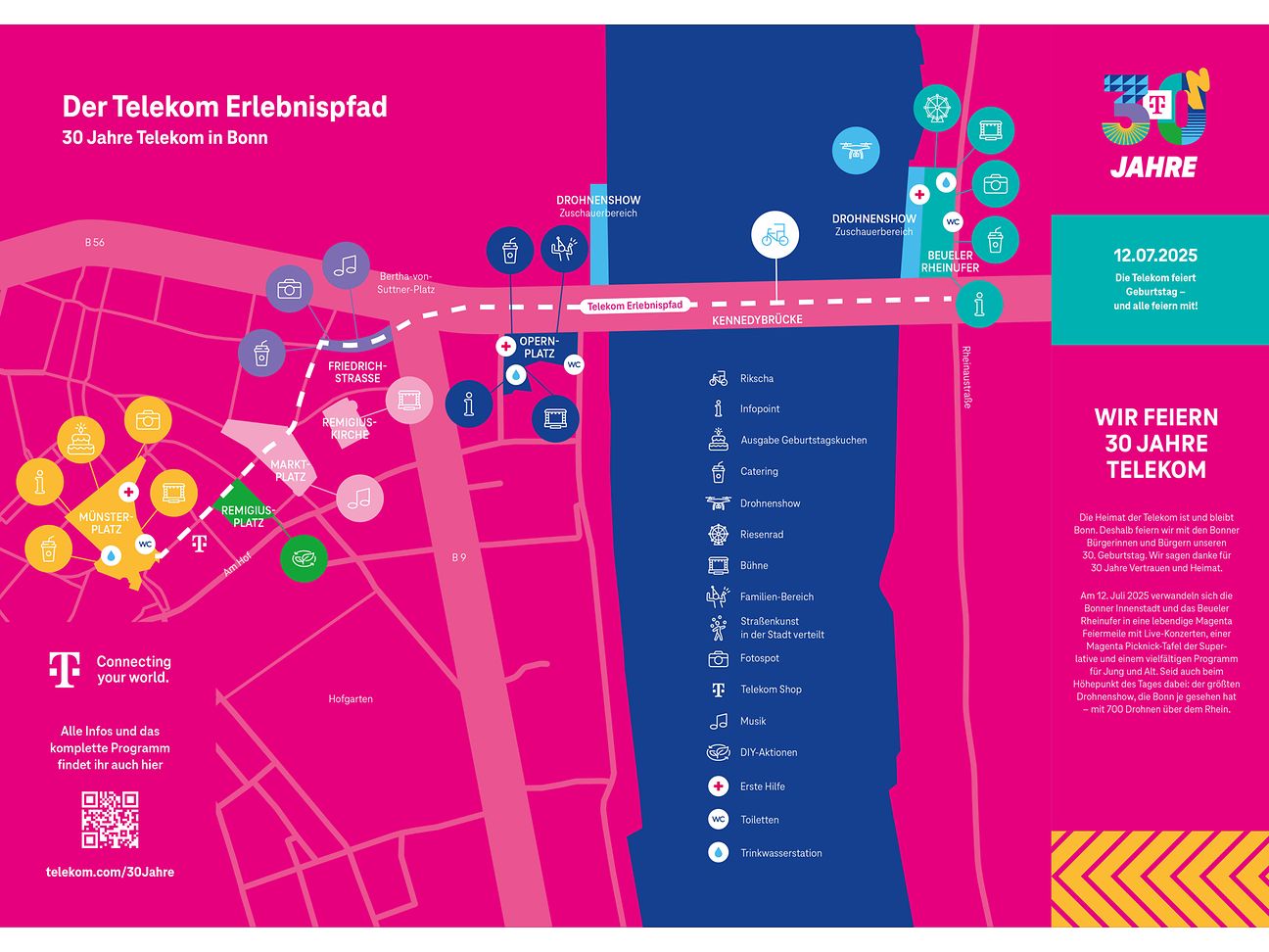 Auf unsere kleinen Gäste wartet hier ein buntes Kinderprogramm mit Telefon-Hüpfburg, Kinderschminken, Riesenseifenblasen, die Wurfburg der Telekom Baskets sowie Bastelaktionen wie Glasfaser-Armbändern, Handy-Haltern und Telekom Geburtstagskronen. Außerdem gibt’s ein Meet & Greet mit Darsteller*innen des Jungen Theaters Bonn – und natürlich leckere Speisen und Getränke für Groß und Klein!