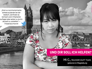 Wir haben vier verschiedene Motive entwickelt, die sich mit unterschiedlichen Themen beschäftigen. Wir sehen uns selbst dabei als Beispiel. Es geht uns aber eher um Hasskommentare im ganzen Social Web. Daher haben wir im Wesentlichen zwei Anliegen: Zum einen sollte man sich immer der Tatsache bewusst sein, dass es Menschen sind, die diese Kommentare lesen und damit arbeiten müssen. Außerdem möchten wir unsere User dazu ermutigen, sich aktiv gegen Hass im Netz zu stellen. Die Hemmschwelle für Beleidigungen im Netz ist nicht sonderlich hoch. Genau so ist aber auch ein schlichtender Kommentar etwas, was nicht viel Überwindung kosten muss. Und genau deshalb unterstützen wir mit unserer Themenwoche das Engagement der Telekom für #DABEI – Gegen Hass im Netz, dass ja viele Maßnahmen und Partner umfasst. Und das unter dem gleichem Motto steht: Worte dürfen nicht zur Waffe werden. Und wir müssen raus aus unserer Schockstarre!