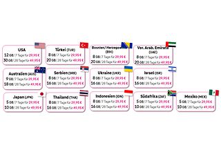 Die Telekom hat für alle Länder der Ländergruppe 2 das Datenvolumen in den Travel & Surf Datenpässen aufgestockt. Darüber hinaus gibt es 13 spezielle Länderpässe für beliebte Reiseziele außerhalb der EU. Diese haben noch mehr Volumen zum gleichen Preis. Je Land stehen zwei spezielle Länderpässe zur Auswahl: sieben Tage für 29,95 Euro sowie 28 Tage für 49,95 Euro.
