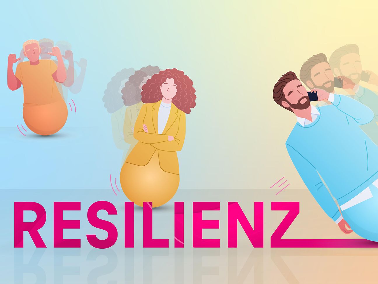3 Personen sind als „Stehaufmännchen“ und Schriftzug "Resilienz"