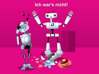 Sie beschreiben, wie wir als Deutsche Telekom mit KI umgehen wollen und wie wir unsere auf KI basierenden Produkte und Services künftig entwickeln. Der Grundgedanke ist, dass KI erstmal nur ein Werkzeug und an sich neutral ist. Es liegt also an uns, sie positiv einzusetzen ohne dabei die Risiken auszublenden und verantwortungsbewusst mit diesen umzugehen. In den Bildern unten zeigt der kleine Roboter falsches Verhalten. Unsere KI-Leitlinien sorgen dafür, dass es bei der Telekom anders läuft.