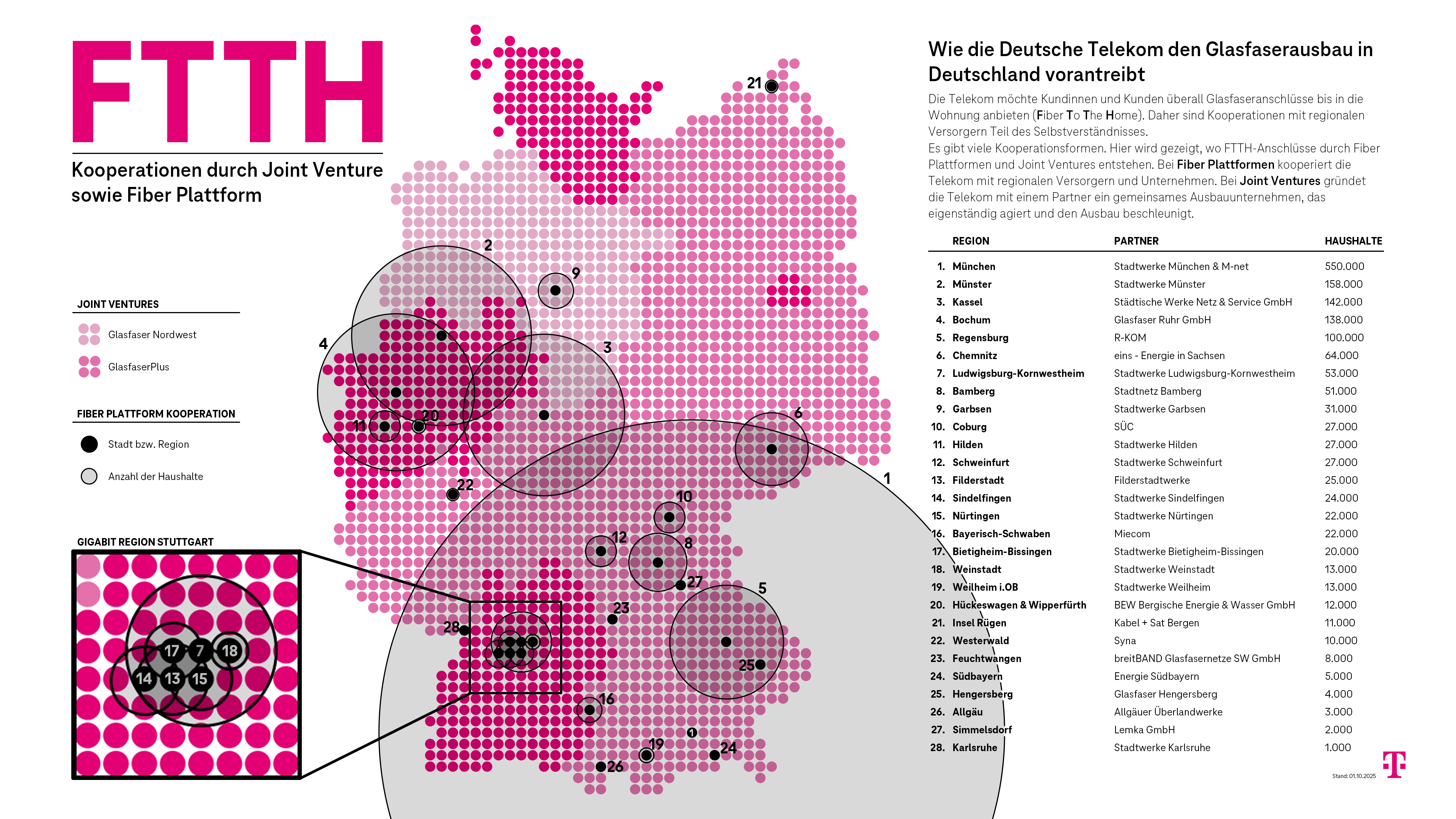 Kooperationen zwischen Netzanbietern gibt es viele. Bei der Telekom wissen wir: Jede von ihnen ist einzigartig. Deswegen werden bei jeder Partnerschaft die regionalen Gegebenheiten in Betracht gezogen, damit es für die Partner betriebswirtschaftlich sinnvoll ist. Dabei sind verschiedene Modelle möglich. Besonders häufig kommen die sogenannten Fiber-Plattformen vor. Hier bauen beispielsweise die Stadtwerke das passive Netz, die Telekom betreibt es dann aktiv. Es ist ebenfalls möglich, dass das Netz neben der Telekom von weiteren, lokalen Telekommunikationsanbieter betrieben wird. Dann spricht man von einer Fiber Plattform mit mehreren aktiven Netzbetreibern, wie dies jetzt beispielsweise in München der Fall ist. Wir und unsere Partner sind jedenfalls davon überzeugt: Glasfaserausbau ist Teamsport. Jeder dritte Glasfaseranschluss von der Telekom entsteht in Kooperationen. Dazu zählen auch unsere Joint Ventures Glasfaser Plus und Glasfaser Nordwest. Und jede Partnerschaft ist ein wichtiger Schritt hin zu mehr Teilhabe und damit ein gutes Signal für die Digitalisierung Deutschlands.