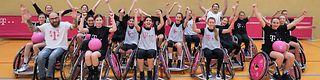 Rollstuhlbasketball-Mannschaft bei der Teambesprechung.