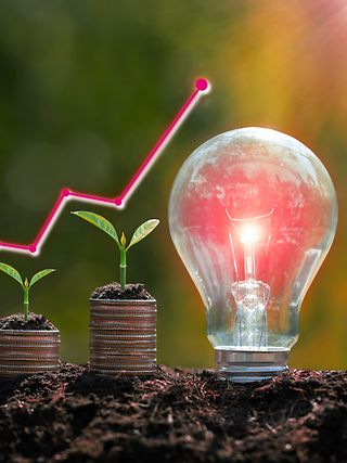 Die Glühbirne befindet sich auf dem Boden und Pflanzen wachsen auf gestapelten Münzen.