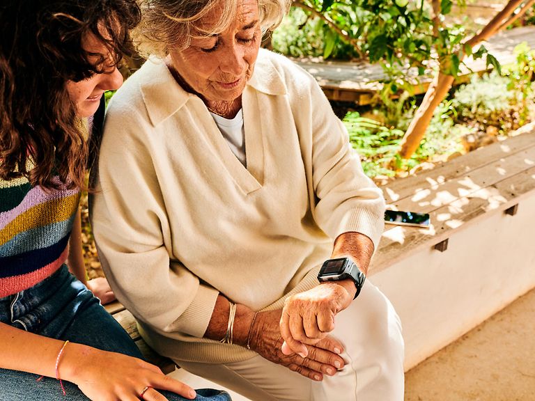 Ältere Dame zeigt Enkelin ihre Smartwatch.
