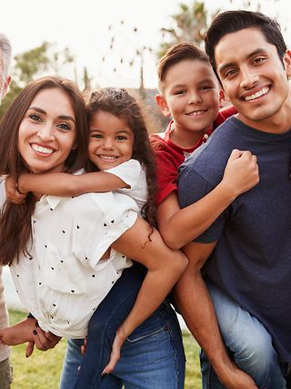Eine sechsköpfige Familie sitzen zusammengedrängt auf dem Sofa.