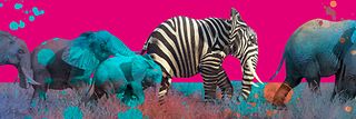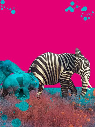 Ein Herde Elefanten auf dem Bild, einer von ihnen hat eine Zebrahaut und setzt sich damit vom Rest ab.