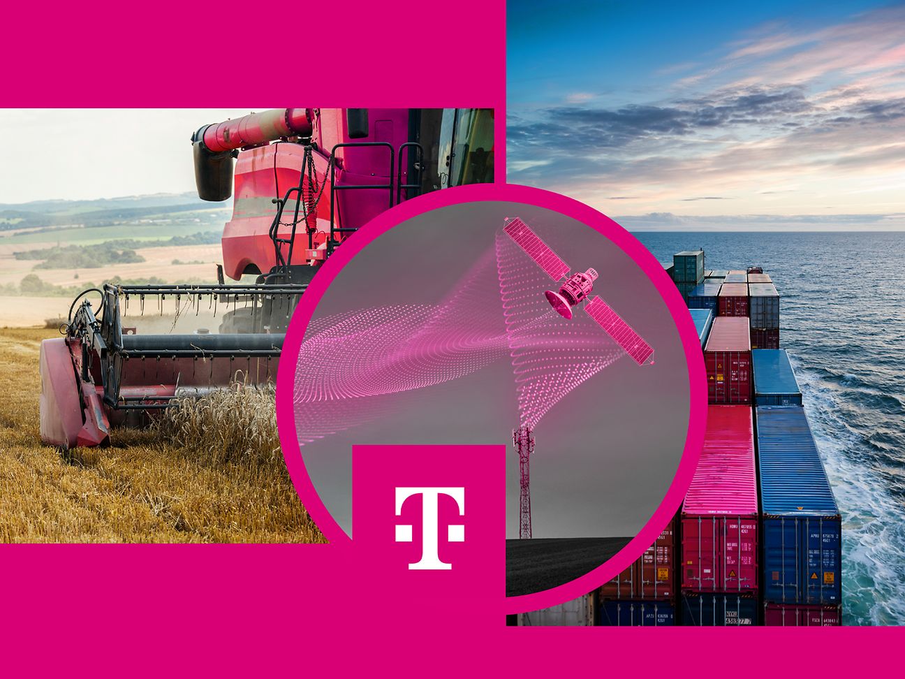 Schmuckbild IoT-Satellitenkonnektivität mit Mähdrescher und Containerschiff