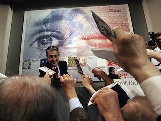 Auf der Hauptversammlung gibt der damalige Telekom Vorstandsvorsitzende Ron Sommer Autogramme.