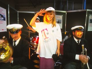 „Wir hatten am Standort Elmshorn im Instandsetzungszentrum zwei Bands – eine davon spielte auch im Lagerbereich. Wir waren viele Leute, es müssen um die 900 gewesen sein“, erinnert sich Gaby Wichmann, die damals im Fortbildungsbereich gearbeitet hat. Sie versprühte offenbar so gute Laune, dass der Fotograf sie direkt als Model verpflichtete. „Dafür sollte ich Shirt und Käppi anziehen. Eigentlich hatte meine Kollegin uns beiden extra für die Feier ein Kleid genäht – unser „magenta“ war allerdings eher lila, denn ein Stoff in so einer Farbe war damals nicht zu finden“, sagt sie. Das schicke „T-Shirt“, das sie für das Foto übergezogen hat, wurde übrigens bundesweit an alle Beschäftigten verteilt – wenn auch zum Teil mit Verspätung, da die Produktion nicht rechtzeitig fertig wurde. „Den meisten Leuten war es viel zu groß. Es wurde nämlich nur in Maximalgröße ausgeliefert, damit auch jeder da reinpasst“, erzählt Gaby Wichmann.