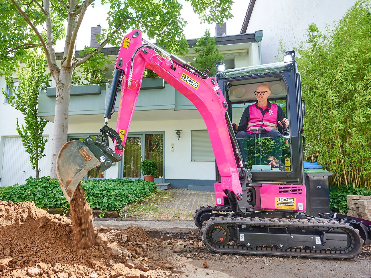 Der Chef von der Telekom Tim Höttges bedient den Bagger. Danach kommen die Glasfaser-Kabel in die Erde. © Deutsche Telekom